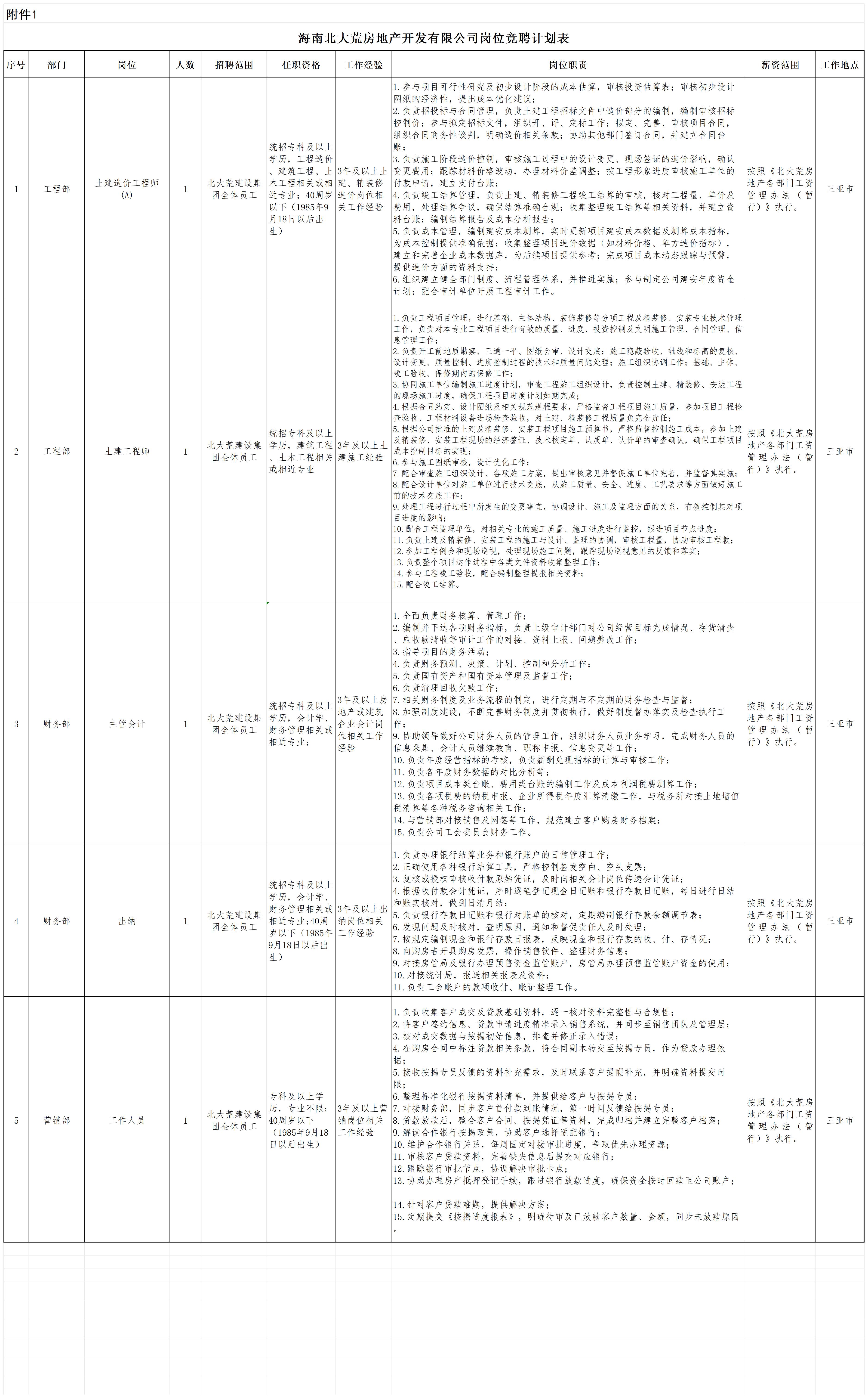 海南北大荒房地產開發(fā)有限公司共計5個崗位。競聘崗位、任職資格、工作經驗及崗位職責等信息,詳見《崗位競聘計劃表》(附件1)。